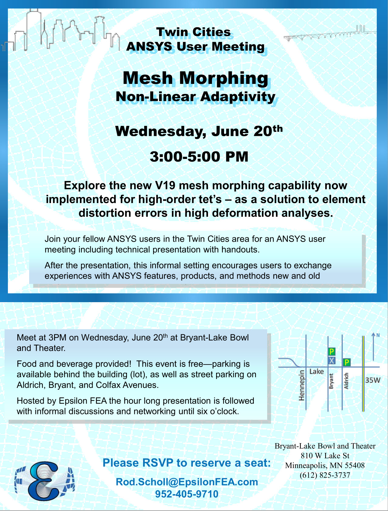 Epsilon FEA is hosting another user meeting!  The topic is Nonlinear Adaptivity and Mesh Morphing; it will be held June 20th, 2018 at the Bryant-Lake Bowl in Minneapolis.  Click here for more information, and contact us to RSVP.